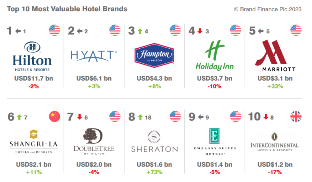 根据报告,希尔顿的品牌价值为117亿美元,稳居榜首位置。2022年,希尔顿的品牌价值显著增长,今年的增长势头虽略有放缓,不过仍高于疫情之前的水平,几乎是第二名凯悦(61亿美元)的两倍。