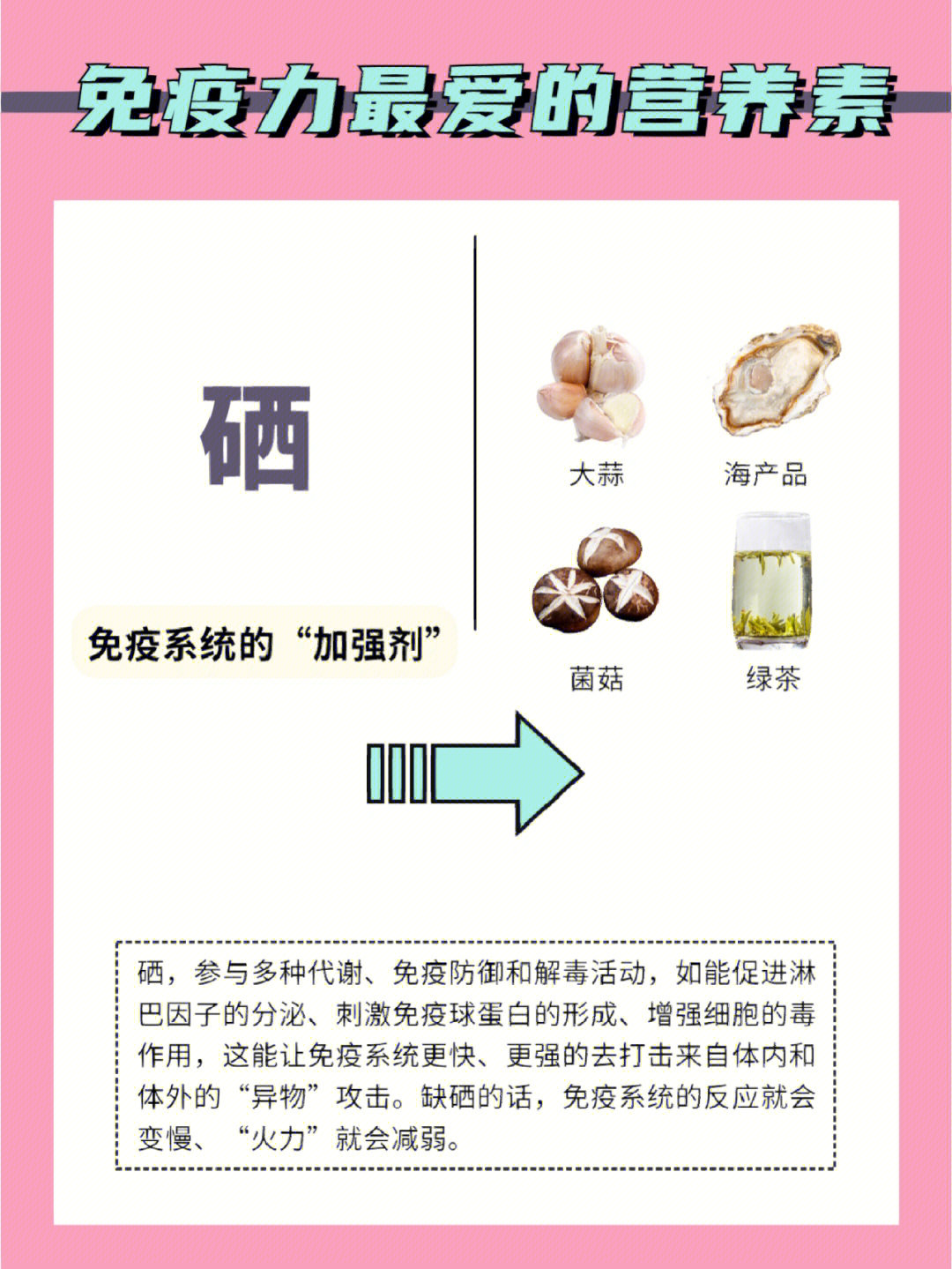硒能提高人体免疫,促进淋巴细胞的增殖及抗体和免疫球蛋白的合成。硒对结肠癌、皮肤癌、肝癌、乳腺癌等多种癌症具有明显的抑制和防护的作用,其在机体内的中间代谢产物甲基硒醇具有较强的抗癌活性。硒与维生素E、大蒜素、亚油酸、锗、锌等营养素具有协同抗氧化的功效,增加抗氧化活性。同时,硒具有减轻和缓解重金属毒性的作用。