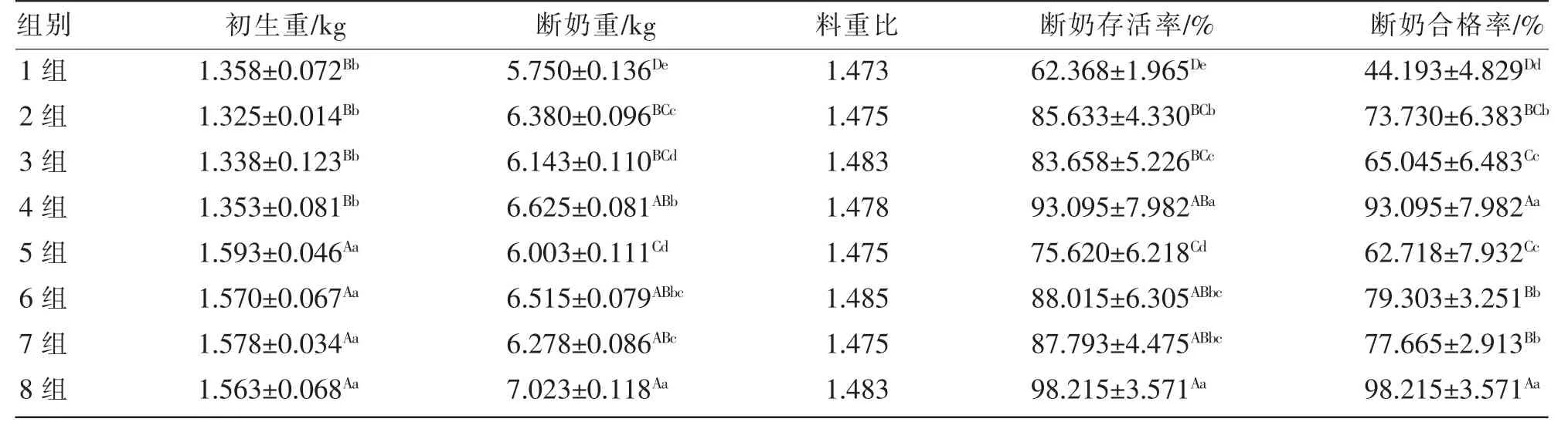 2.1.2 仔猪不同形式补铁补硒对仔猪生长性能的影响由表3 可以看出,从1~4 组来看,4 个组仔猪的初生重无显著(P>0.05)差异;2 组、3 组、4 组仔猪的断奶重、断奶存活率、断奶合格率均极显著(P<0.01)高于1 组,4 组仔猪的断奶重和断奶存活率显著(P<0.05)高于2 组和3 组,4 组仔猪的断奶合格率极显著(P<0.01)高于2 组和3 组;2 组仔猪的断奶重、 断奶存活率、 断奶合格率均显著(P<0.05)高于3 组。从5~8 组来看,4 个组仔猪的初生重同样无显著(P>0.05)差异;6 组、7 组、8 组仔猪的断奶重、断奶存活率、断奶合格率均极显著(P<0.01)高于5 组,8 组仔猪的断奶重、断奶存活率、断奶合格率均显著(P<0.05)或极显著(P<0.01)高于6 组、7 组,6 组仔猪的断奶重、 断奶存活率、断奶合格率与7 组相比差异均不显著(P>0.05)。 仔猪不同形式补铁补硒对料重比影响均不显著(P>0.05)。 综合以上结果,说明仔猪补铁补硒能够有效提高初生重、 断奶重、 断奶存活率和断奶合格率;在2 种形式的母猪补铁补硒条件下,仔猪基础日粮中添加甘氨酸螯合铁和硒代蛋氨酸效果优于肌注铁硒合剂和基础日粮中补充硫酸亚铁和亚硒酸钠; 当母猪基础日粮中添加硫酸亚铁和亚硒酸钠时, 仔猪肌注铁硒合剂的效果优于基础日粮中补充硫酸亚铁和亚硒酸钠。