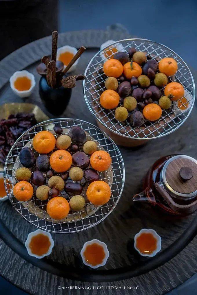 当然,也不会放过烤盘上的任何一块空地,红枣,柿子、糍粑、栗子,还有糕点和棉花糖,把烤盘填得满满当当。一个火炉子一壶茶,几个朋友和说不尽的话,这份“慢慢的热闹”,成了这个冬天的一个点缀。