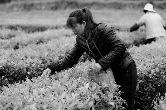 4月15日,天气晴好,茶农们早早下了三鹤园,采摘鲜叶。这个时节已经是采摘粗叶的阶段,茶农们双手一起不停在茶间飞舞,速度比采摘细叶快得多。74岁的唐兵武算是采摘的技术指导,“采摘要轻扯,不能掐,掐会造成红梗,影响茶叶下一轮萌芽”。