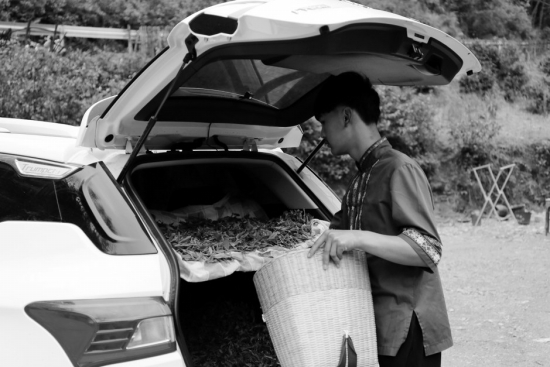 ▶4月10日,工作人员在收购鲜叶,将鲜叶放置在后备箱摊晾。