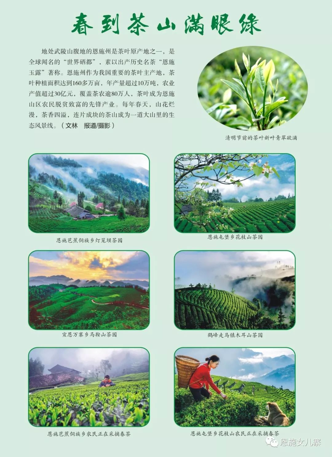 春分过后,鄂西山区气温逐步回升,国家非遗项目富硒茶叶恩施玉露之乡的湖北恩施市茶农为赶制清明节前茶叶上市,采取召回打工人员和雇请外地人员采摘茶叶等形式,抢季节采摘新茶和加工,恩施的雨后茶山,云雾缭绕,新茶吐绿,茶农在鲜花掩映下的茶园里犹如一幅田园牧歌风光画,美不胜收。恩施市地处武陵山区,是茶树原产地之一,是全球闻名的“世界硒都”。恩施市现有茶园35万亩,有22万多亩茶园适制恩施玉露。现在,全市285家茶企积极投身精准扶贫工作,共结对帮扶12391户贫困户39651人,茶叶产业已成为恩施市精准脱贫的先锋产业。