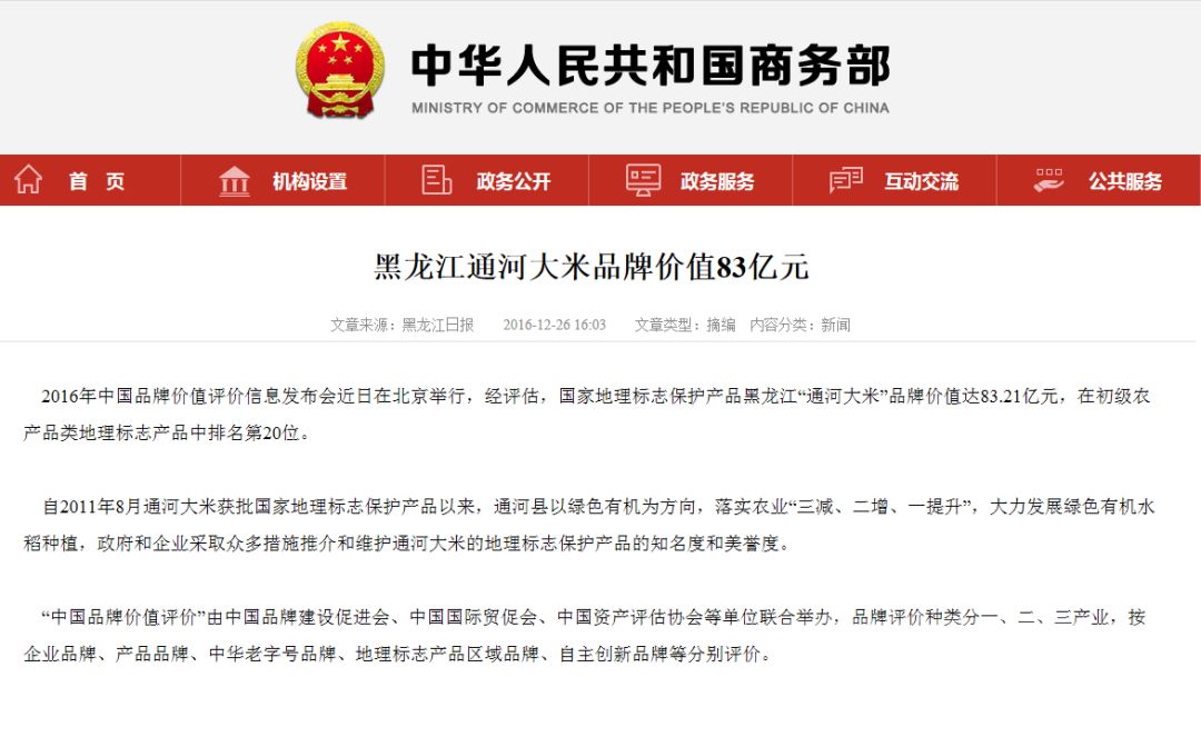 在 “2016年中国品牌价值评价信息发布会”上,通河大米以品牌价值83.21亿元的成绩首次向国内外发布,切实增强了通河大米在国内、国际市场的品牌认知度。