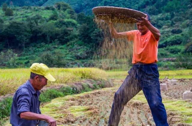 收稻时使用人工打谷,稻谷不易受损,颗粒更加完整。