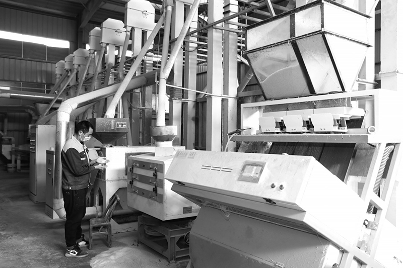 沙市镇的一家米厂里,机器轰鸣,黄灿灿的谷子借助传送带快速向脱谷机里涌去。