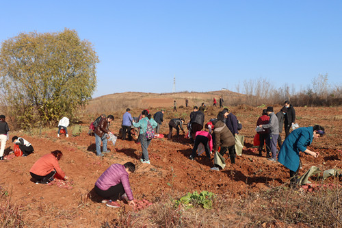 11月26日,汝阳县华沟村千亩红薯种植示范基地内迎来110名洛阳市区游客消费体验华沟香甜“富硒红薯”开挖季。
