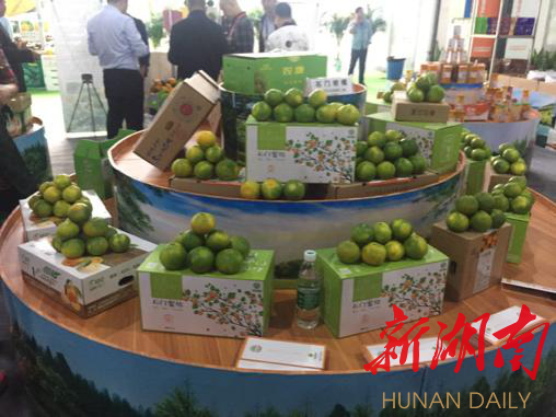 “黄金贡柚为橘与柚杂交的新品种,因皮色金黄、个大如柚而得名。”怀化展馆的负责人介绍, 贡柚好剥、多汁味甜是最大的卖点。黄金贡柚自2007年引进怀化,经过8年精心栽培,种植逐渐规模化,上百户因种植这“黄金果”而脱贫致富。