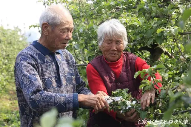 杨会选的父亲杨克让(右)老先生,看到儿子整天忙在果园里,心疼孩子的老人就过来做些力所能及的事情!