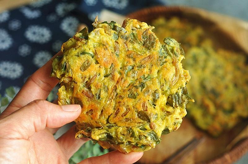 所有食材准备好,芹菜叶汆烫,稍微切碎。食材全部混合后,分成小面剂,放入锅中煎熟即可。