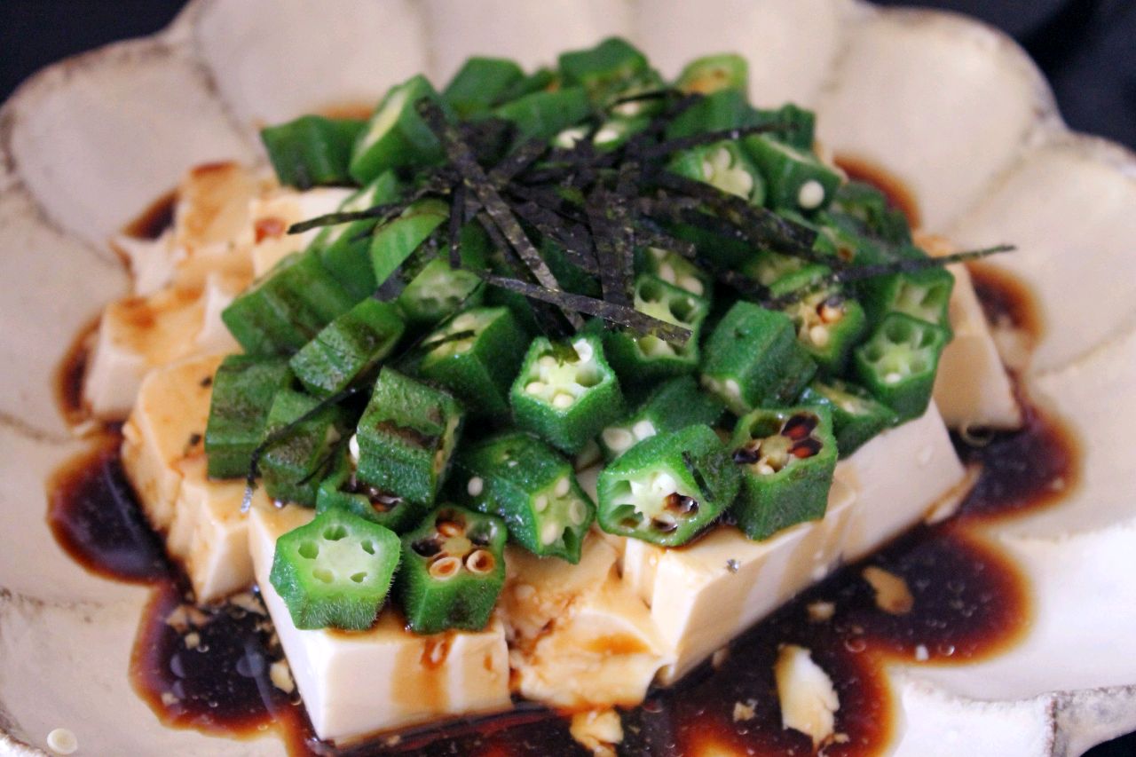 现在,我老公也跟着我一块吃起了黄秋葵。闲暇的时候,我会来上一道黄秋葵拌豆腐,准备的材料也不复杂,豆腐60克、黄秋葵30克、枸杞3克、鲣鱼酱油15克、绿芥末酱5克。将枸杞泡水5分钟后取出备用;取一深锅,加入分量可淹过食材的水,将黄秋葵放入沸水中汆烫熟后取出,切碎备用;取一碗,放入碎黄秋葵和绿芥末酱一起搅拌均匀成酱汁;在豆腐中央部分挖一个洞,放入加工好的黄秋葵,再放上枸杞装饰,淋上适量鲣鱼酱油即可享用。豆腐中丰富的蛋白质让人有很强的饱腹感,更能提高新陈代谢。与黄秋葵互相搭配,减肥的效果更佳。
