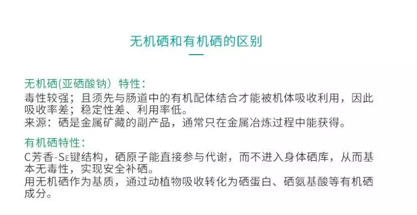 而无机硒主要来自化学合成的硒酸钠、亚硒酸钠等。无机硒必须先与肠道内的有机配体结合才被人体吸收。肠道内存在多种因素与硒竞争有机配体,所以大大影响了无机硒的吸收。无机硒在体内还易与维生素发生结合,稳定性差,生物利用率低。无机硒毒性比较大,很难控制用量,如果在人体内局部过量,会对人体造成伤害。
