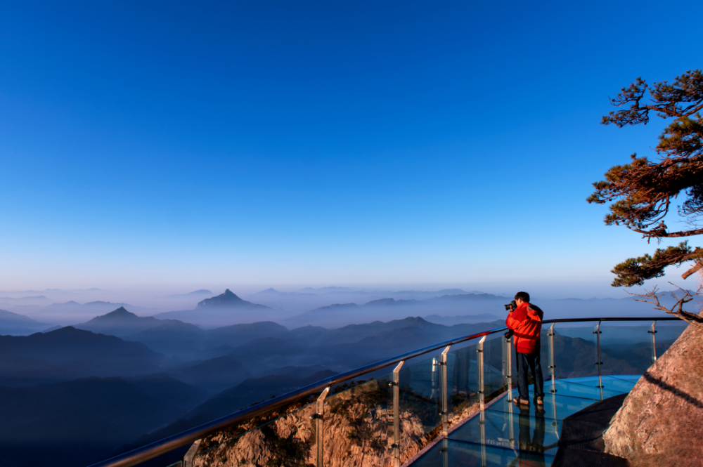 “灵山九华,美在花台”,沿着1000米高空绝壁之上的栈道,登高望远、极目远眺,山峰绵延、云雾缭绕,透过薄雾的彩林若隐若现……九华山秋色如山水画卷般徐徐展开。