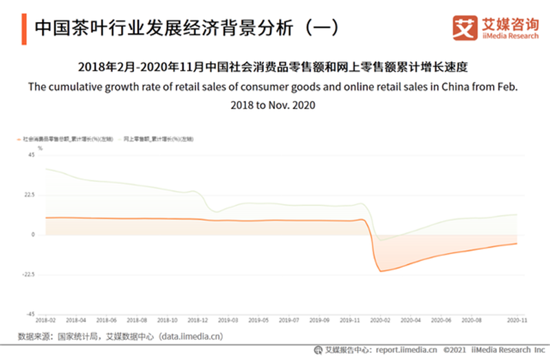 数据显示,2020年1-2月,中国社会消费品零售总额和网上零售额双双下降。自4月开始,网上零售额率先恢复增长,而社会零售额仍在缓慢恢复,说明网上零售模式在疫情期间成为经济增长的重要抓手,特别是直播电商的火爆发展。这在一定程度上推动了茶企业数字化的程度,并加快和加深线上渠道的业务布局。