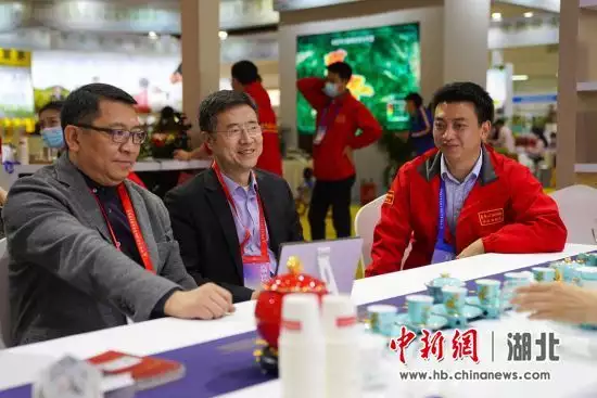 农民日报社党委委员、副社长王磊(左一)与前恩施州委常委、副州长李岩(中)到场关心恩施硒茶参展情况 杜维 摄