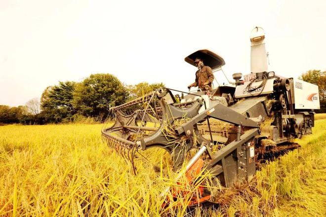 金色秋阳下,无边沃野上,成排的收割机在田地里“奔跑”,丰收的田埂上运粮车往来穿梭,农民脸上洋溢着灿烂的笑容,丰收的欢声笑语在田间山谷里回荡,奏响欢快的丰收乐章。