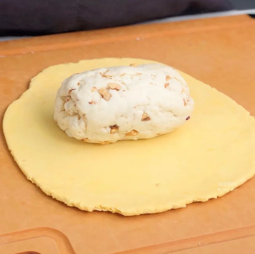 10、南瓜粉面团擀开擀薄放上核桃仁面团,把南瓜粉面团提起捏合收口,收口处朝下放置,轻轻揉一下整形;