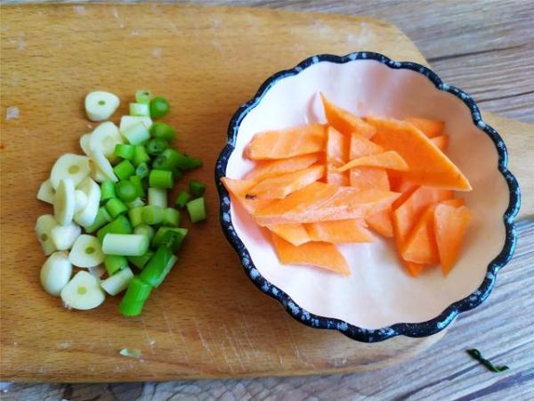 食材:西兰花90克、虾仁半碗、胡萝卜1小段、食用油适量、盐适量、蚝油1勺、水淀粉适量、小葱一根、蒜2瓣、淀粉少许、料酒1勺