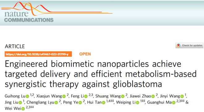 基于对切除GBM中乳酸水平升高的观察,中科院过程所魏炜研究员、马光辉院士和深圳市第二人民医院李维平教授、谭回研究员等人开发了新型仿生治疗纳米颗粒(NPs),可为基于乳酸代谢的协同治疗递送药剂。在这种仿生纳米系统中,自组装纳米颗粒被封装在胶质瘤细胞衍生细胞膜中,因此很容易穿透血脑屏障并通过同型识别靶向GBM。到达肿瘤后,NPs中的乳酸氧化酶(LOX)将LA转化为丙酮酸(PA)和过氧化氢(H 2O 2)。一方面,PA通过阻断组蛋白表达和诱导细胞周期阻滞来抑制癌细胞生长;另一方面,H 2O 2可与一同递送的双[2,4,5-三氯-6-(戊氧羰基)苯基]草酸反应释放能量,该能量进一步被共递送的光敏剂Ce6利用以产生细胞毒性单线态氧,从而杀死胶质瘤细胞。实验最终证明,这种协同作用可对胶质瘤细胞系衍生和患者衍生异种移植模型发挥强大的治疗效果。相关工作以“Engineered biomimetic nanoparticles achieve targeted delivery and efficient metabolism-based synergistic therapy against glioblastoma”为题发表在Nature Communications。