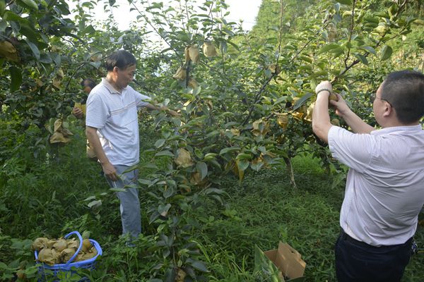 近日下午5时许,建峰化工、涪陵区果品办、九三学社涪陵区委农林支社、敦仁支社一行,驱车来到海拔600米的南沱镇红碑村7组(小地名:瓦泥堡)淑娜果树种植场,映入眼帘的是一片绿海,一株株梨树随风摇曳,树上挂满了密密麻麻套着袋的梨子,浓郁的果香弥漫在整个梨园,格外诱人。
