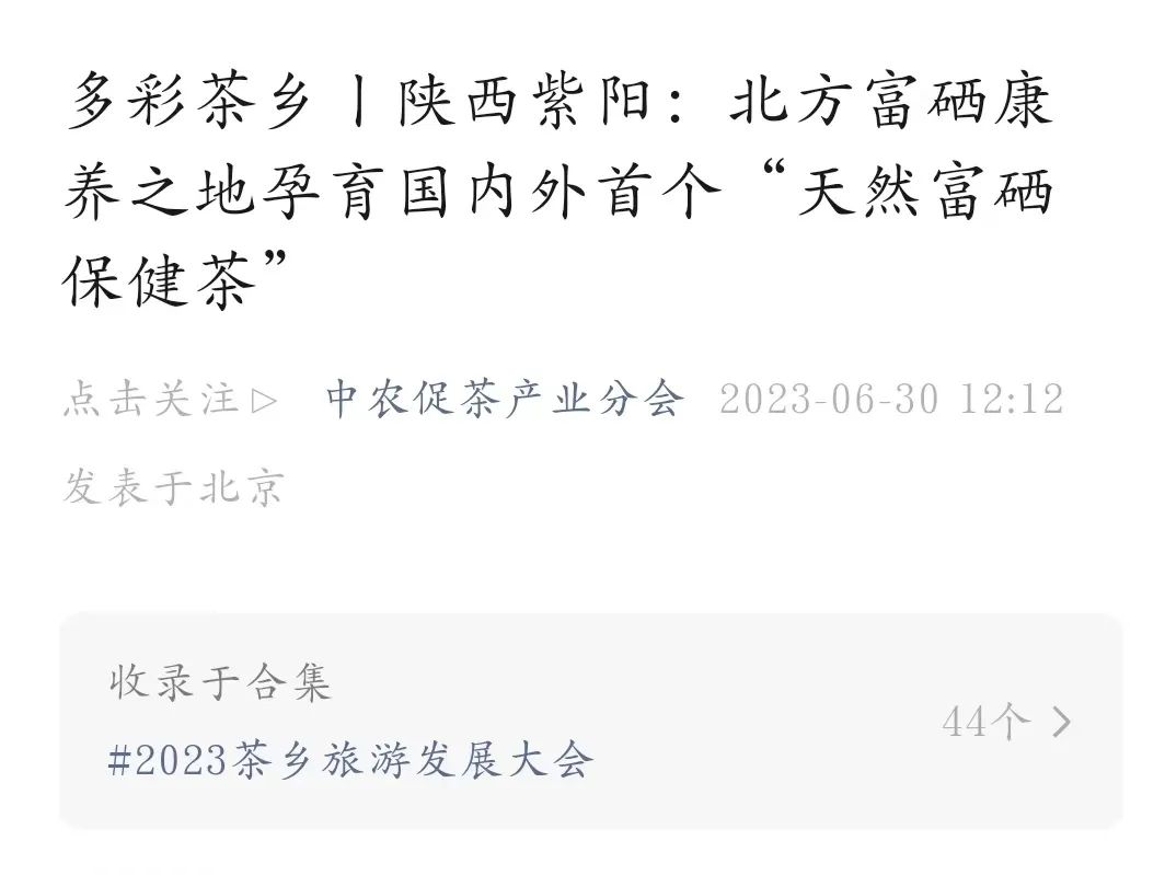 2023年第四届茶乡旅游发展大会在浙江省杭州市国博中心举行,本次活动主题以“非遗”与茶乡旅游的融合发展作为大会的主题;而紫阳茶作为北方富硒康养之地,是国内颇具特色的“多彩茶乡—特色魅力茶乡”,因此中农促茶产业对紫阳富硒茶进行了专门的推介报道。