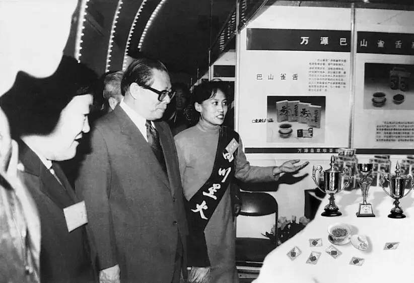 1991年“七·五”星火科技成果巴山雀舌获金奖江总书记视察巴山雀舌展台