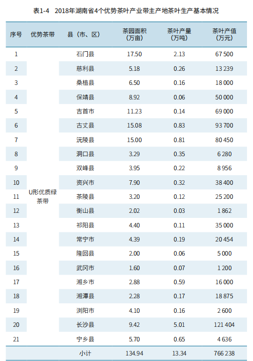 湖南省成为全国茶叶优势区域规划中的名优绿茶和出口绿茶优势区域,是全国著名的“绿茶优势产业带”“黑茶产业中心”“中国黄茶之乡”,形成了绿茶、黑 茶、红茶、黄茶、花茶等多茶类发展的产业结构。