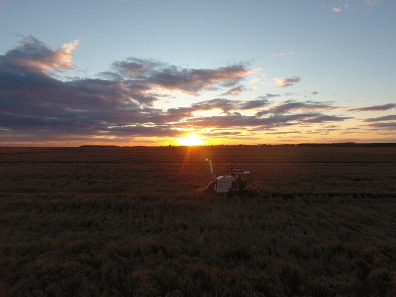10月14日,收割机在黑龙江省绥滨县鑫源水稻种植专业合作社的耕地里收割水稻。