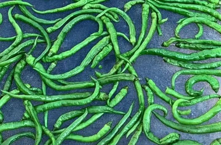 3.辣椒放入锅中焯水前后1分钟左右,焯水可以更好地起到杀菌消毒的好处,而且焯水后,捞出要晾干水分,会更加容易。辣椒捞出,将它放在比较通风的容器上面晾晒。可以是纱网直接铺上,辣椒放在上面后,用手将它们摊开,留有缝隙,这样晾晒更容易晒干;