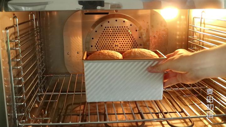 由于面筋强度较弱,在整形阶段,应尽量减少对全麦面团的折叠。只需要轻轻揉圆,直接放入吐司盒即可。全麦吐司在烘烤前后的体积几乎不会发生变化,所以发酵至理想高度(略高于模具)很有必要。然而,最后醒发的时间也不能过长,否则一定会塌陷。重要事情再说一遍,增加吐司高度最好的方法是增加全麦粉用量,而不是拼命延长发酵时间。