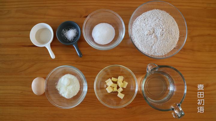全麦粉350克,奶粉14克,耐高糖干酵母4克,食盐4克,细砂糖30克,全蛋液50克,水220克,无盐黄油20克