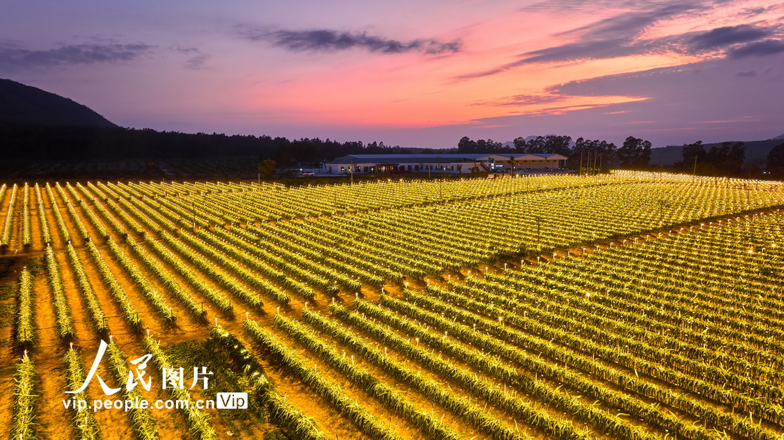 2023年2月18日傍晚,海南省昌江县乌烈镇的一家现代化农业企业的火龙果种植基地,十数万盏对火龙果进行“催花补光”、促进火龙果光合作用的灯光便同时亮起,整个基地顿时宛如一片灿烂星海,蔚为壮观。这家近2000亩的火龙果种植基地,不仅吸纳了300多名当地农民进场务工,而且带动村民学会了火龙果种植技术,形成了一批农业产业工人,进一步提高了当地农民的收入。史家民摄(人民图片网)