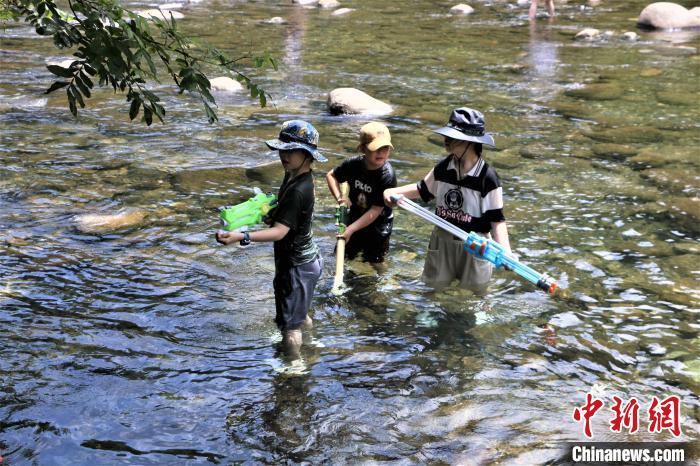 26日,许多小朋友在池州市石台县牯牛降景区中打水仗。刘浩 摄