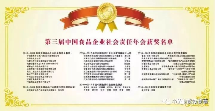 12月9日,第三届中国食品企业社会责任年会暨企业家精神论坛在北京召开。福建硒来乐生态农业有限公司、霞浦万家福农业专业合作社等福建优秀食品企业获得2016—2017年度中国食品行业责任品牌奖。福建光泽德顺酒业有限公司由于企业规模增速喜人,优秀企业家郑友忠成行业榜样, 获2016—2017年度中国食品行业企业家精神风云人物。