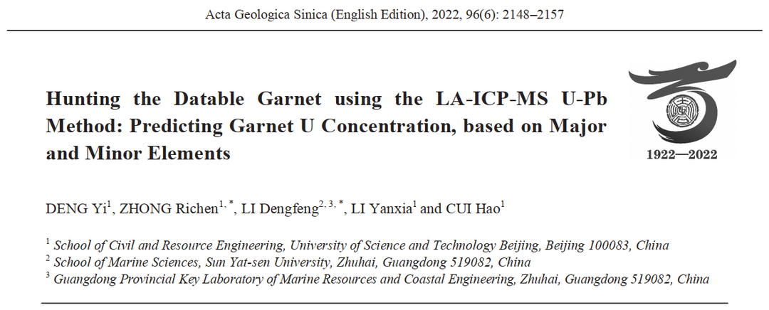 Deng et al., 2022. Hunting the Datable Garnet using the LA-ICP-MS U-Pb Method: Predicting Garnet U Concentration, based on Major and Minor Elements. Acta Geologica Sinica (English Edition), 96(6): 2148–2157. DOI: 10.1111/1755-6724.14921