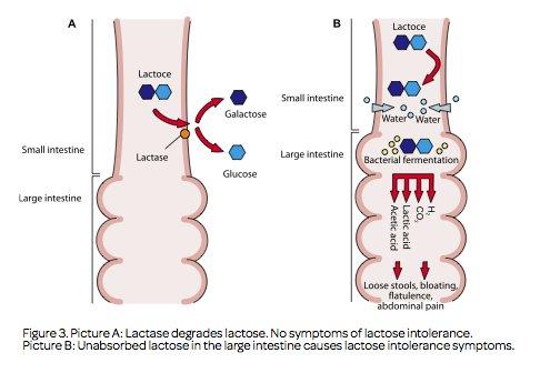 乳糖不耐受是消化道内乳糖酶含量过少,导致牛奶中的乳糖很大一部分不能被分解而发酵,引起腹泻,放屁等症状。