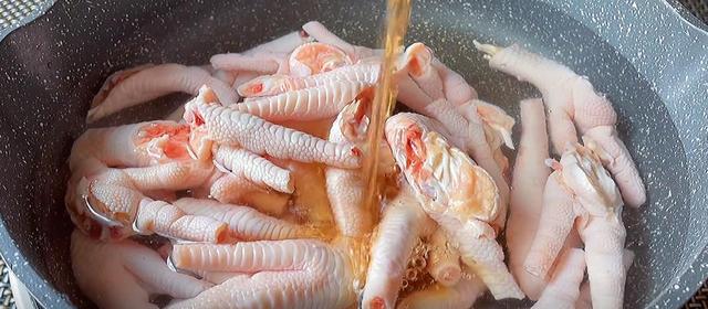 1、鸡爪洗净,冷水下锅,放料酒,煮沸后焯水5分钟捞起。