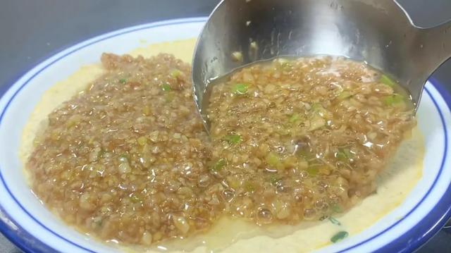 9、将肉末馅料倒在鸡蛋豆腐上面。