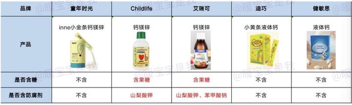 含糖会让小孩喜欢吃,但是也可能会增加龋齿和肥胖的风险,5款产品中可以从成分表中看,Childlife和艾瑞可都含有fructose(果糖)成分,而且含量还不少,例如艾瑞可的果糖排在水后面、钙前面,除了果糖,艾瑞可还含有sweetener(代糖)和sucralose(蔗糖)。