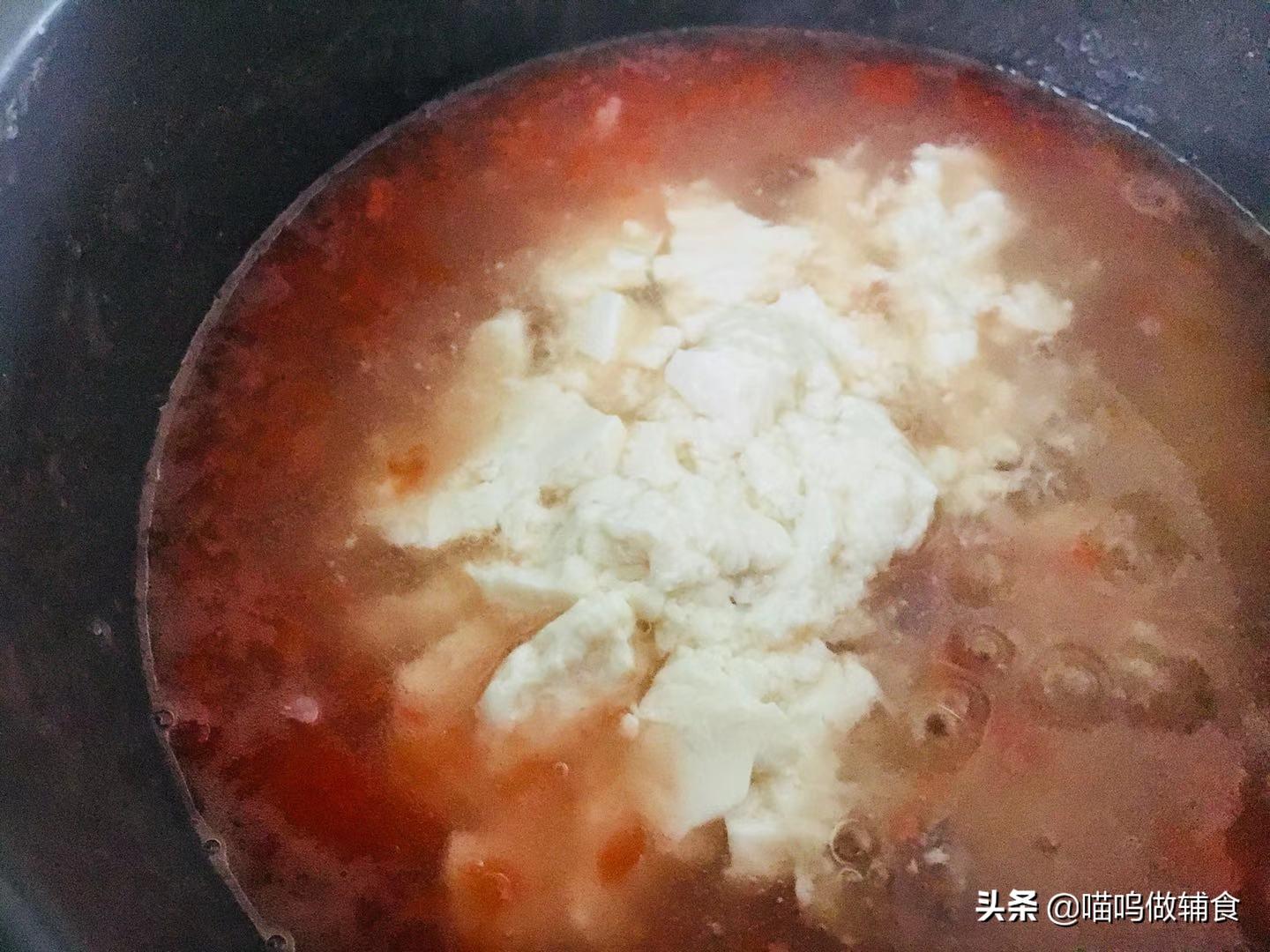 10 煮至汤汁浓稠时候加入豆腐碎。