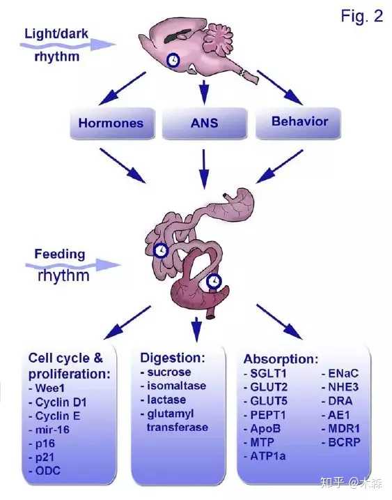 肠道细胞增殖是节律性的——肠道细胞的DNA合成主要在深夜,而细胞分裂主要是在一天的前半段。