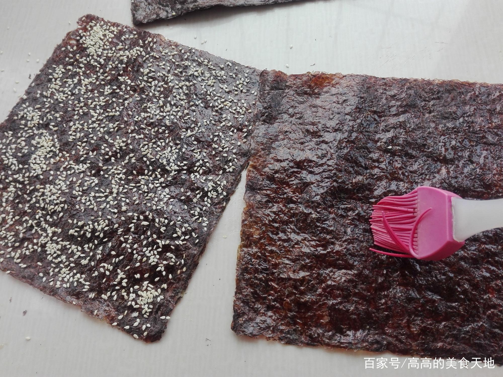 1、刷海苔的表面时,一定要用刷子将每个地方都刷到调味汁,同时一定也要注意,不要多刷,只需用刷子刷上薄薄的一层调味汁即可,这样口感才会更佳哦。