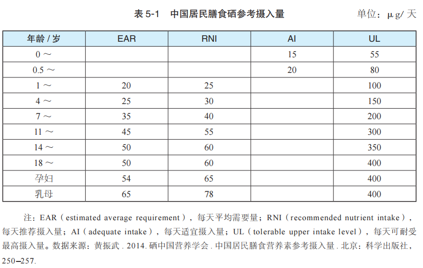 表 5-1 是中国营养学会提供的中国居民各年龄段每天硒参考摄入量(中国营养学会, 2014)。