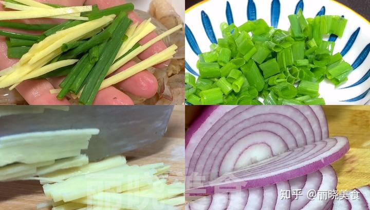 4、接下来再准备一些洋葱 先给洋葱 清洗一下,接着再给洋葱切成葱丝,然后再给切成葱花 再准备一些大蒜 拍碎 再给剁成蒜蓉 再准备一些生姜 切成姜丝 再给剁成姜末 再准备一些辣椒 切成辣椒碎