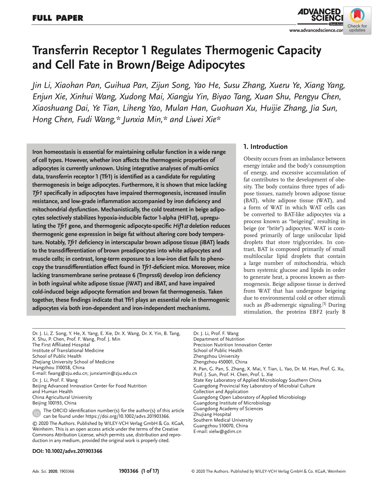 1.Li J#, Pan X#, Pan G, Song Z, He Y, Zhang S, Ye X, Yang X, Xie E, Wang X, Mai X, Yin X, Tang B, Shu X, Chen P, Dai X, Tian Y, Yao L, Han M, Xue G, Zhong H, Sun J, Chen H, Wang F*, Min J*, Xie L*. Transferrin Receptor 1 Regulates Thermogenic Capacity and Cell Fate in Brown/Beige Adipocytes.Advanced Science2020.
