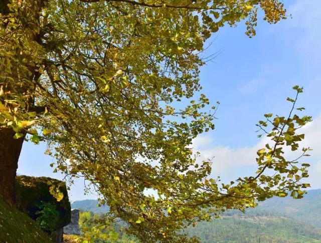 古银杏或生长在农家院落旁,或扎根于峭壁上,夏季绿意盎然,秋季金色一片,与其他树种浑然一体,俨然一幅色彩斑斓的风景画。