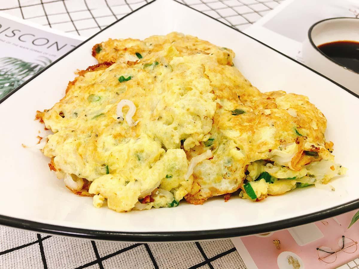 7、接着将银鱼蛋饼煎得两面金黄后,就可以关火出锅了,端上桌直接蘸着酱油吃味道非常鲜美,大人小孩都爱吃。