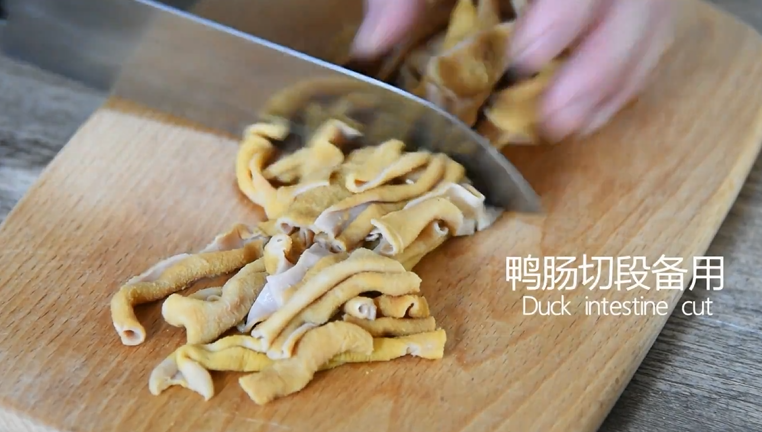 6.倒入油豆腐炒软,倒入鸭肠煸炒至变色