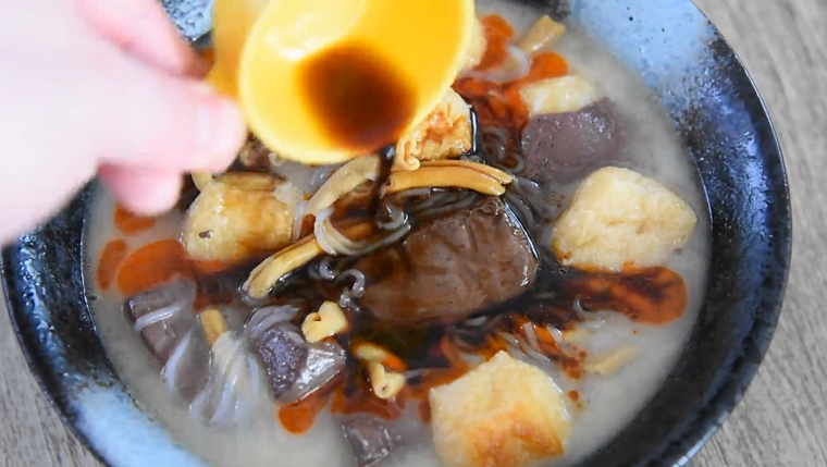 鸭血 1块、鸭肠 20克、粉丝 1卷、油豆腐 适量、高汤 1碗、生抽 1勺、陈醋 1茶匙、精盐 少许、胡椒粉 1茶匙、辣油 1茶匙、葱 3根、姜 少许