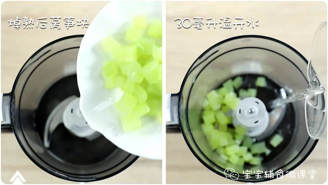 焯水后,捞出,辅食机内倒入莴笋块和60毫升温开水,搅打细腻。